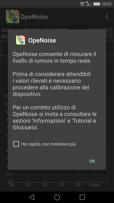 Dopo aver preso visione delle condizioni di utilizzo si avvia la app e comincia automaticamente a misurare il rumore.